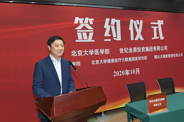 黄涛在致辞中表示:“在新冠病毒突如袭来之时,北医人白衣为甲、逆行出征。在这种医者仁心的精神感召下,世纪金源集团愿以捐款奉献绵薄之力。”对于双方的战略合作关系,他相信:“依托双方资源实力,这一合作必将加快推动前沿科学发展,促进高端人才培养,创新科技成果转化,有力推动机制创新,促进产学研的深度融合,为健康中国事业赋能。”
